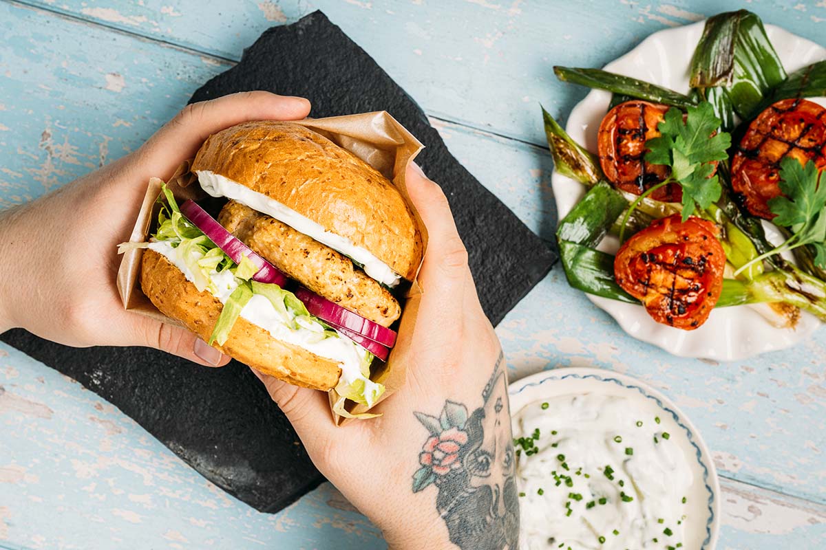 Kanaburgerin kokoaminen kannattaa aloittaa pannulla paistetulla tai grillatulla kanapalalla, jonka päälle voit lisätä esimerkiksi cheddar-juustoa. Lisää täytteeksi salaatinlehtiä, viipaloitua tomaattia ja avokadoa. Viimeistele burgeri valitsemallasi kastikkeella ja nauti aidosta ja puhtaasta mausta.