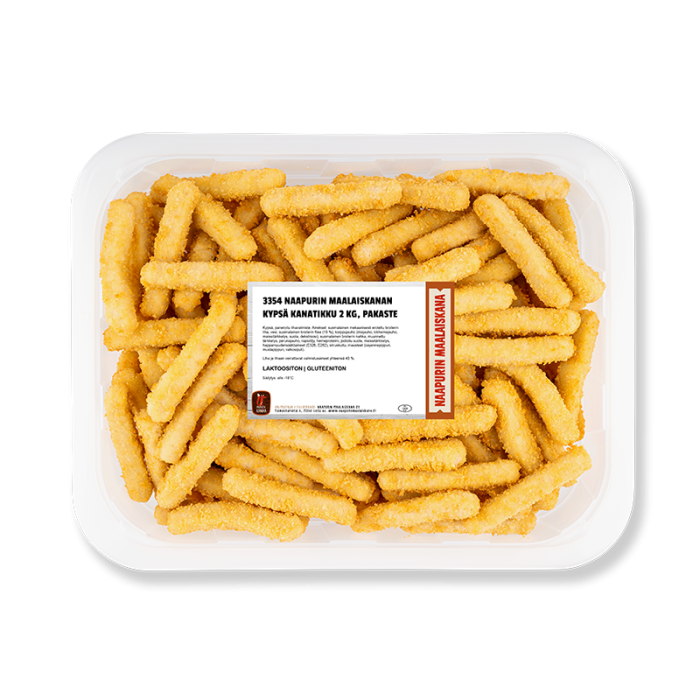 Ainekset: suomalainen mekaanisesti eroteltu broilerin liha, vesi, suomalainen broilerin filee (19 %), korppujauho (riisijauho, kikhernejauho, maissitärkkelys, suola, dekstroosi), suomalainen broilerin nahka, muunnettu tärkkelys, perunajauho, rapsiöljy, herneproteiini, jodioitu suola, maissitärkkelys, happamuudensäätöaineet (E326, E262), sitruskuitu, mausteet (cayennepippuri, mustapippuri, valkosipuli). Liha ja lihaan verrattavat valmistusaineet yhteensä 40 %.