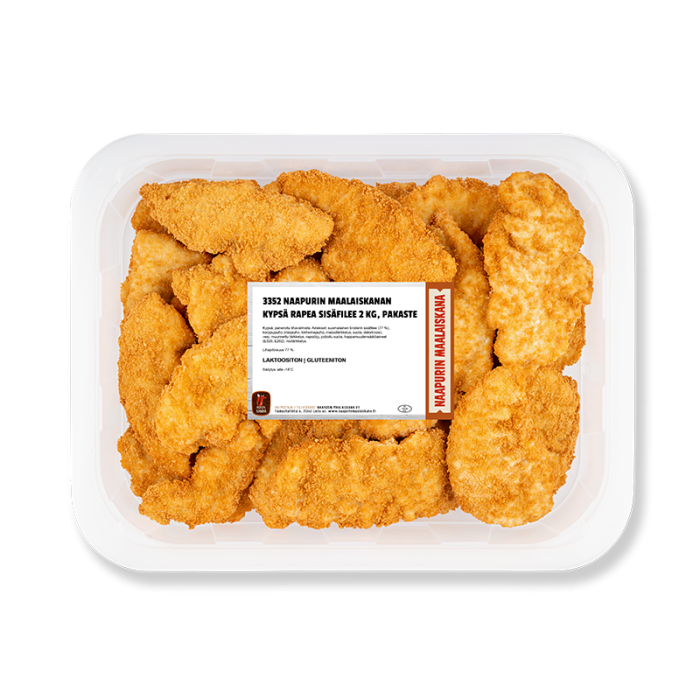 Ainekset: suomalainen broilerin sisäfilee, korppujauho (riisijauho, kikhernejauho, maissitärkkelys, suola, dekstroosi), vesi, muunnettu tärkkelys, rapsiöljy, jodioitu suola, happamuudensäätöaineet (E326, E262), riisitärkkelys.