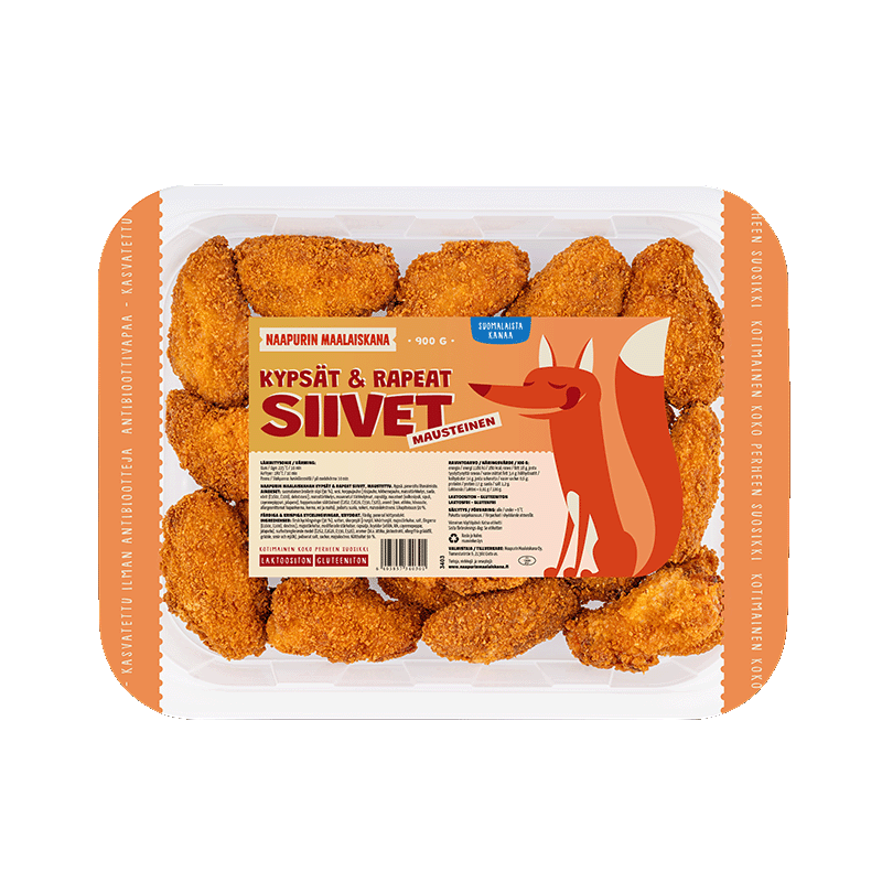 Kypsä, paneroitu lihavalmiste. Ainekset: suomalainen broilerin siipi, vesi, korppujauho (riisijauho, kikhernejauho, maissitärkkelys, suola, dekstroosi), maissitärkkelys, muunnetut tärkkelykset, rapsiöljy, happamuuden säätöaineet (E326, E262), jodioitu suola. Lihapitoisuus 89 %.