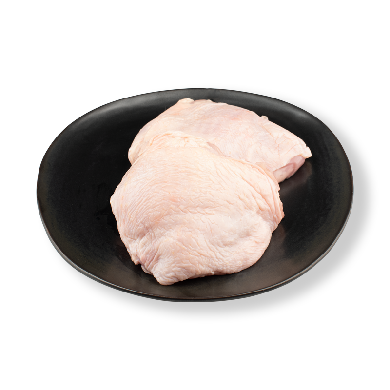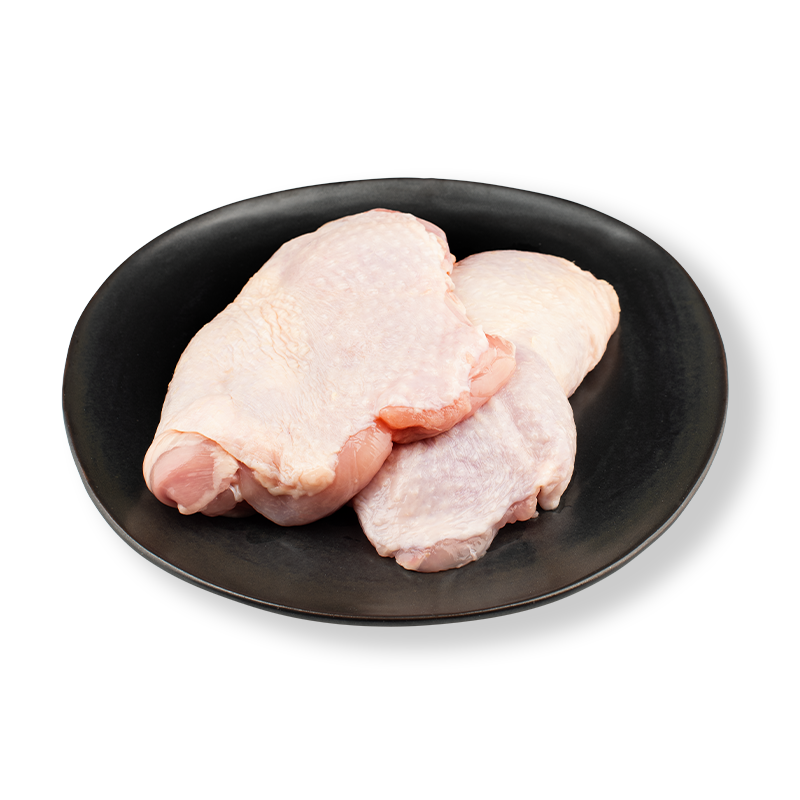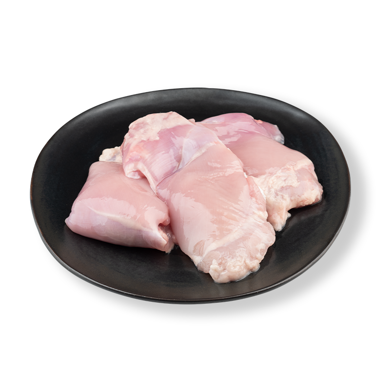 Pintamaustettuja broilerin luuttomia, nahattomia reisipaloja.
