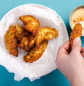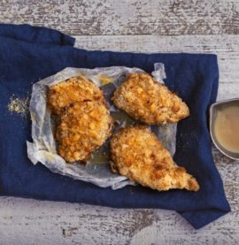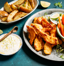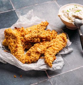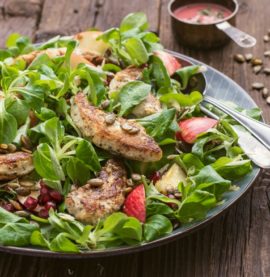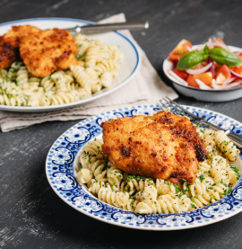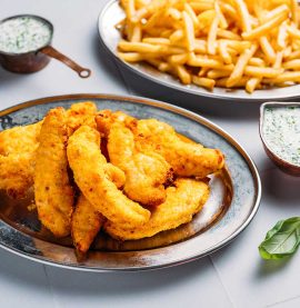 Rapeaa kanaa ja ranskalaisia tuorekurkkusalaatilla