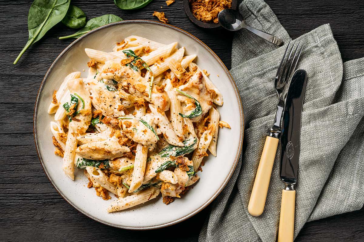 Tässä reseptissä kermainen kanapasta saa lisää ryhtiä juustosta, joka sulaa kastikkeen joukkoon ja tekee siitä vieläkin pehmeämmän ja maukkaamman. Tuore pinaatti antaa kastikkeelle kivasti väriä ja raikkautta, ja annosten viimeistely paahdetulla sipulirouheella tuo ruokaan mukavan rapean elementin.
