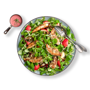 Tämä ronskin ruokaisa kanasalaatti loistaa väreillään ja maullaan. Halutessasi voit muunnella reseptiä vaihtamalla cheddarin muuhun pitkään kypsytettyyn juustoon tai käyttämällä siementen sijaan pähkinöitä tai manteleita.