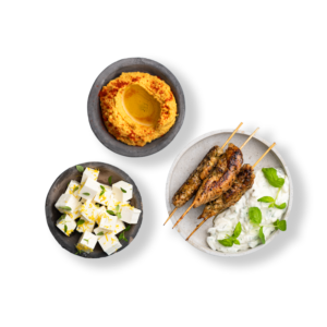 Meze-ruokien henkeen kuuluu, että on paljon erilaista maisteltavaa. Jos laajan meze-setin valmistaminen itse vaikuttaa liian työläältä, voit hyvin hankkia osan komponenteista valmiina kaupasta ja keskittyä olennaiseen, eli herkutteluun.