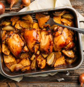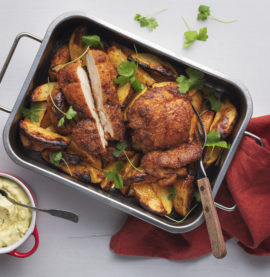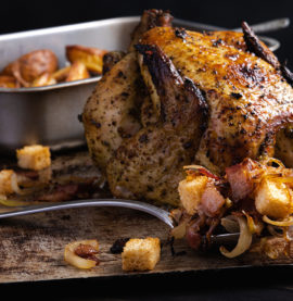 Kokonainen kana, sipuli-pekoni & paahdetut perunat