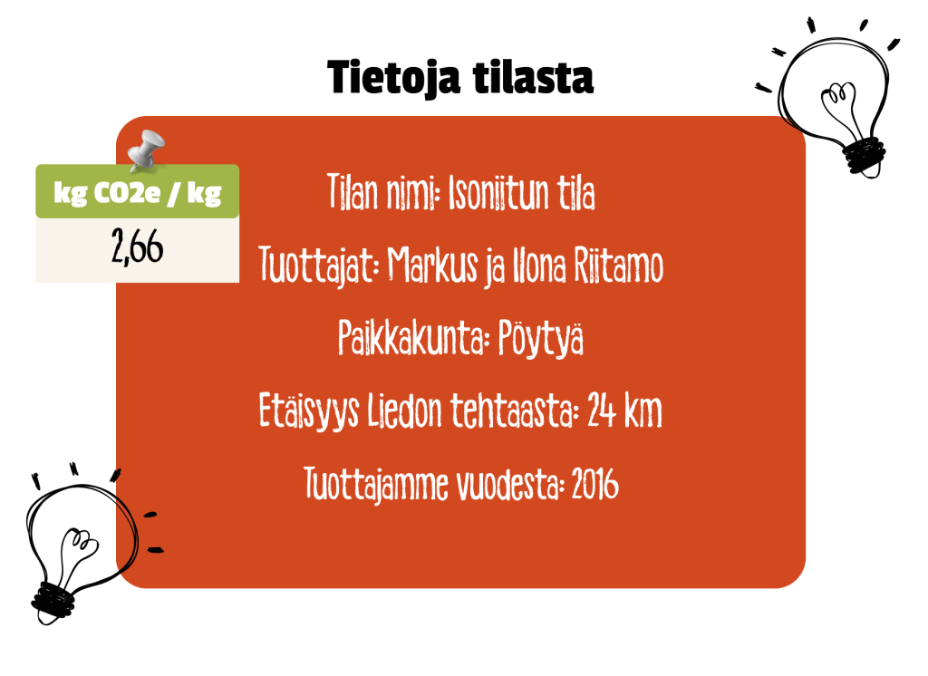 Isoniitun tilalla työskentelevät Markus ja Ilona Riitamo sekä Markuksen vanhemmat Olavi ja Tarja Riitamo. Tila sijaitsee 24 kilometrin päässä Naapurin Maalaiskanan Liedon tehtaalta.